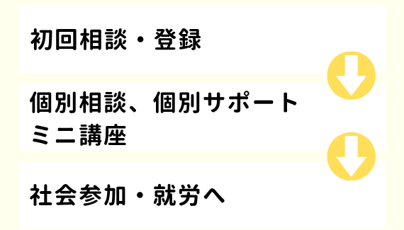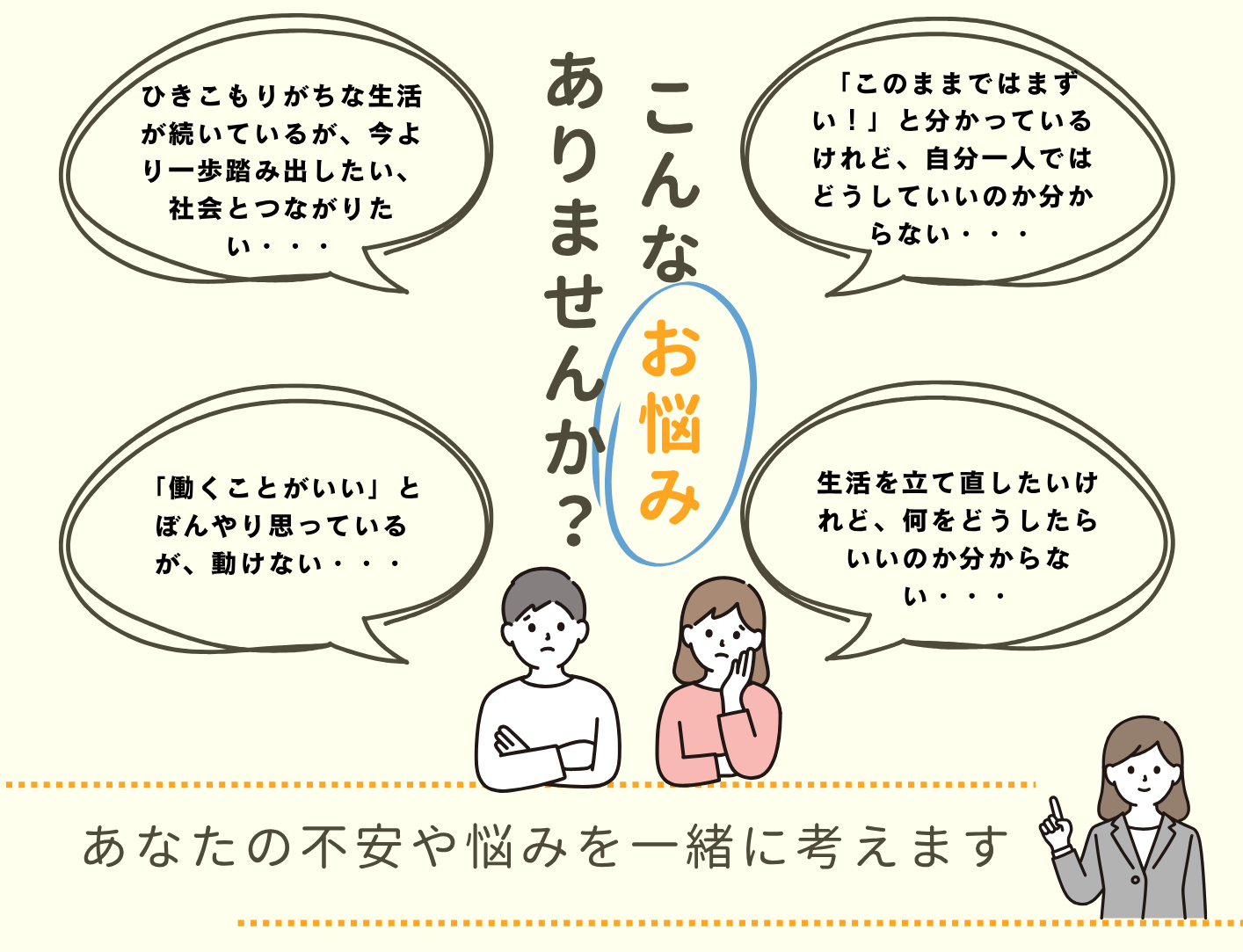 あなたの「変わりたい」という気持ちを尊重し、あなたの主体性を大切にしながら、社会との関わりを持つ体験や活動につなげることを目指しています。